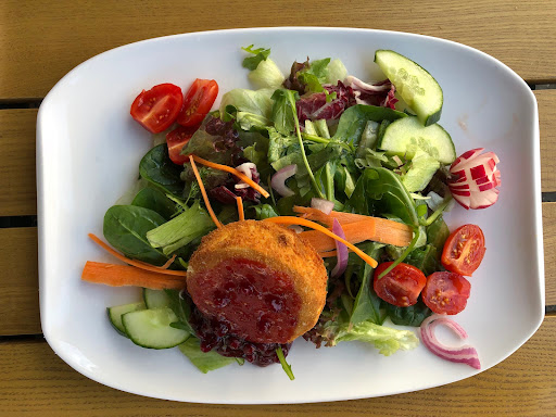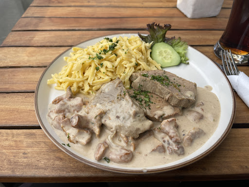 Food was good but they let us wait really long before taking our order for drinks (I think over half an hour) and then they refused to serve tap water. Which we did not expect to be for free. In Vienna you pay between 2 and 4 Euros per glass and that would have been fine but maybe it's a culture thing. The food was good. I had goat cheese with a very elaborate salad. The pasta with salmon was also very well received. One vegetarian friend was startled by the bacon in the roasted potatoes (another culture shock) and the vegetarian options in general are rather limited. Prices were a bit higher probably because of the location near the convention center and the Dokomi weekend (goat cheese salad was around €15, salmon pasta €18). Our waiter was a bit condescending at times but...