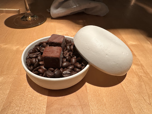 Zum Abschluss gab es noch einen Gruß aus der Küche: gereiste Zartbitterschokolade in Würfelform. Dies hat die Einfallslosigkeit des Küchenchefs noch mal ordentlich unterstrichen.
