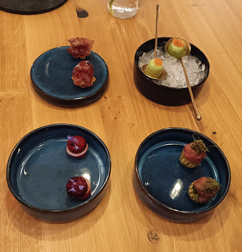 Als Vorspeise gab es unter anderem kleine Pralinen mit Roter Beete und Aal, welche überhaupt nicht fettig und extrem frisch waren. Die Pralinen waren sehr überraschend und haben mehrere Sinne gleichzeitig bzw. Nacheinander gekitzelt. Ein richtig starker Auftakt.
