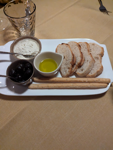 Nach der Getränkebestellung gab es einen Gruß aus der Küche: Artischockencremit, Oliven und Brot mit Olivenöl. Nett! Als Vorspeise teilten wir uns den Vorspeisenteller "Tagliere Tradizionale Toscano" mit Schicken, Salami und Käse aus der Toskana. Das war schon mal ein sehr leckerer Auftakt. Zur Hauptspeise wählten wir zum einen "La Pappardelle", Bandnudel mit Wildschweinragout, und zum Zweiten einmal das Perlhuhn mit Trauben und das Durok Schweine-Kotelett mit Pflaumen. Alle Speisen waren ausgezeichnet und konnten uns komplett begeistern. Zum Dessert bestellten wir ein warmes Schokoladen-Törtchen mit Mango-Eis. Auch dieses war fantastisch!
