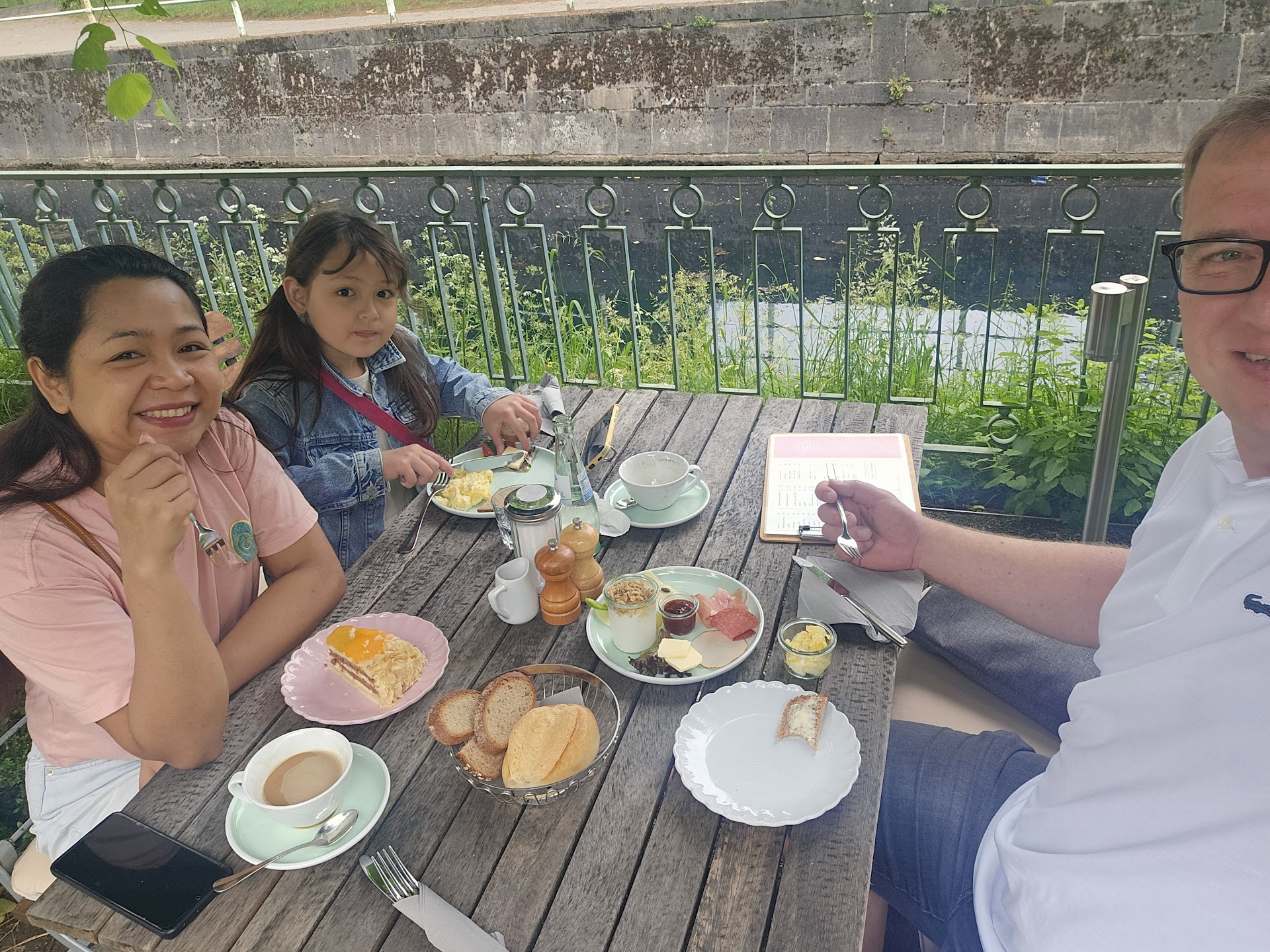 Nach geschätzten 10 Minuten wurde es der Gruppe zu bunt und sie gingen in den Nebenraum, wo der Kaffee zubereitet wird zum bezahlen. Damit wir irgendwann auch mal zu unserem Kaffee kämen, ging ich auch nach nebenan und bat um eine Kellnerin (man hatte uns im Vorfeld schon erklärt, man bestellt am Tisch, als wir uns die Kuchen anschauten). Die Dame entschuldigte sich auch und versprach, sofort jemanden vorbei zu schicken. Das dauerte dann nochmal gute 10 Minuten .. die dann herbei eilende Kellnerin meinte, sie wär grad erst aus der Pause zurück .. ok .. ist ja nicht schlimm. Wir orderten also Kaffee und Kuchen ... der Kaffee kam nach ein paar Minuten .. der Kuchen dauerte locker nochmal 6-7 Minuten, so dass der Kaffee schon halb leer war und auch merklich abgekühlt. Der Kaffee und der Kuchen war an sich ok ... Der Kuchen war uns im Vorfeld von der Kellnerin in den höchsten Tönen angepriesen worden - er war lecker ja, aber ich hab schon bessere gegessen, also nichts außergewöhnliches.