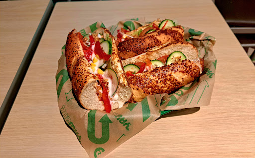 Read moreSubway ist eine der besseren Franchise-Ketten. Hier gibt es frisch und gut belegte Baguettes / Sandwiches mit allen möglichen Fleischsorten, Salaten, Soßen und Brotsorten, die man sich aus unzähligen Zutaten selbst zusammenstellen kann, mit vielen zusätzlichen Extras. Von den Zutaten her hat man hier auch ein gesünderes bzw. nährstoffreicheres Fast-Food als bei manchen Burger-Ketten. Die Sandwiches schmecken insgesamt gut und frisch. Am Bestellterminal kann man sich seine Sandwiches nach Lust und Laune zusammenstellen, in allen möglichen Variationen und Kombinationen, es gibt eine riesige Menge an Zutaten. Diese werden dann nach der Bestellung frisch belegt und zubereitet. Neben den Sandwiches gibt es z.B. auch Wraps, Salate, gemischte Beilagen, Nachspeisen wie die Cookies und auch einen Stand mit Chips. Die Theke ist offen und man kann sich alle Zutaten anschauen und zusehen, wie es zubereitet wird. Es ist alles sauber und frisch. Der Laden selbst sieht schick und modern aus, drinnen viele Plätze und draußen eine große Terrasse, ebenfalls mit vielen Sitzmöglichkeiten. Vor dem Laden ein Kundenparkplatz und um die Ecke auch eine Tankstelle. Der Laden ist soweit sauber, die Tische haben öfters aber noch Krümel, hier könnte schneller und regelmäßiger nach den Kunden drüber gewischt werden. Die Mitarbeiter sind freundlich, das Essen wird in einer normalen Geschwindigkeit zubereitet. Die Preise sind in Ordnung, dafür, dass man z.B. ein 30cm großes, dick belegtes Sandwich für 10€ bekommt. Manchmal wenn es voller ist, kommen die Mitarbeiter etwas in den Stress bei der Zubereitung und es kann mal etwas länger dauern. Insgesamt bin ich zufrieden mit dem...