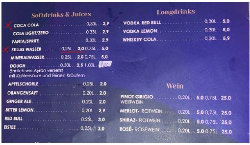 Wir hatten 3 Cola und 2 Wasser bestellt. Lt. Karte sollte die Cola 2,90 EUR kosten und das Wasser 2,00 EUR. Das Wasser wurde jedoch zu 2,90 EUR abgerechnet, angeblich, weil die Auszeichnung auf der Karte falsch sei. Im Internet sei es richtig. Wenn ich in ein Restaurant gehe, interessieren mich keine Internetpreise. Außerdem standen 4 Softdrinks zu viel auf der Rechnung. Hier begann wieder eine Diskussion. Immerhin wurden dann die 11,60 EUR wieder von der Rechnung gestrichen. Leider habe ich übersehen, dass 2 x Wein zu viel abgerechnet wurden, d. h. 10 EUR.