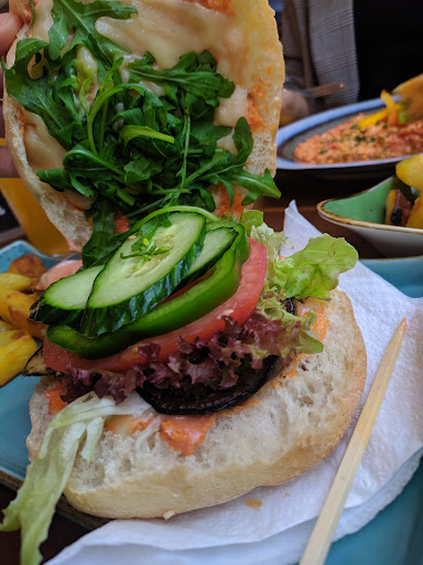Zu essen gab es Hummus mit Brot, Linsensuppe, gebratenes Gemüse und den Halumni-Burger. Der Burger war gut, das war es aber leider auch schon. Beim Hummus fiel auf, dass dieser mit Walnüssen angerichtet war. Leider war dies in der Allergenkennzeichnung so nicht deklariert. Hier im Internet finden sich noch Fotos einer älteren Karte auf denen dies der Fall zu sein scheint. Die aktuelle Karte ist online leider (gerade?) nicht abrufbar. Jedenfalls sorgt so ein Vorfall - mit einer Person am Tisch die gegen Walnüsse hoch allergisch reagiert - nicht gerade für Vertrauen in die generelle Allergenkennzeichnung.