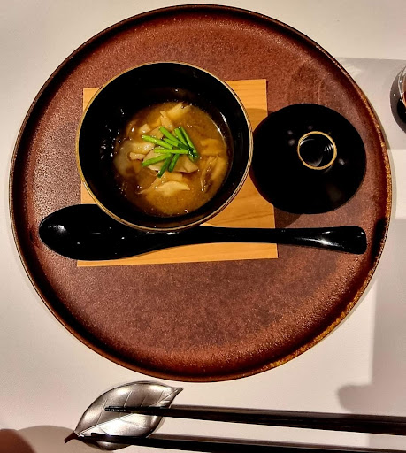 Im nächsten Gang wurde uns eine aromatisierte Misosuppe serviert. Als Einlage gab es eine Fischfarce, als eine Art Klösschen, eine Garnele und viele kleine perfekte japanische Minipilze. Ebenfalls ein Genuss!