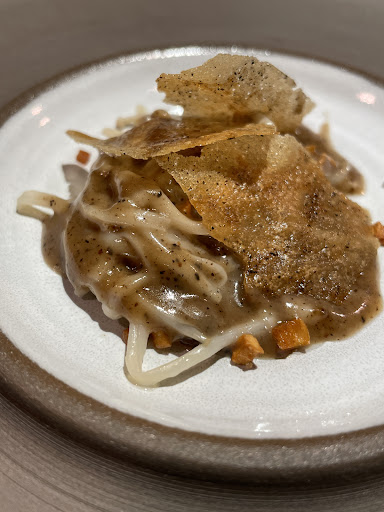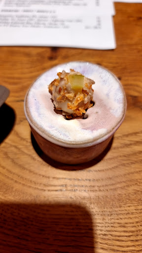 Erster Eindruck & Ambiente Zu Beginn waren wir die einzigen Gäste, weshalb es zunächst angenehm ruhig war. Der Empfang war freundlich, das Interieur wirkte modern und durchdacht. Allerdings fiel schon beim ersten Gang auf, dass die Köche sehr leise und ziemlich schnell erklärten. Selbst in dieser anfänglichen Ruhe war es schwer, alles zu verstehen. Als immer mehr Gäste eintrafen und die Lautstärke im Restaurant deutlich stieg, wurde dies leider nur noch schwieriger.