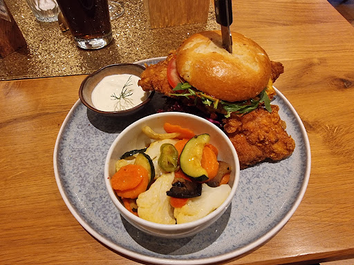 Das Essen war insgesamt in Ordnung, allerdings mit Höhen und Tiefen. Der Chickenburger war gut – das Fleisch knusprig und dennoch saftig. Leider zu viel Rotkohl, der auch das Essen schwierig machte. Das Rindfleischpatty konnte überzeugen, besonders mit seinem perfekten Bratgrad. Leider war das mediterrane Gemüse eher enttäuschend: Fast ausschließlich Blumenkohl und Karotten, dazu sehr ölig und geschmacklich eher nach Curry als mediterran. Hier wäre eine ausgewogenere Zusammenstellung wünschenswert.