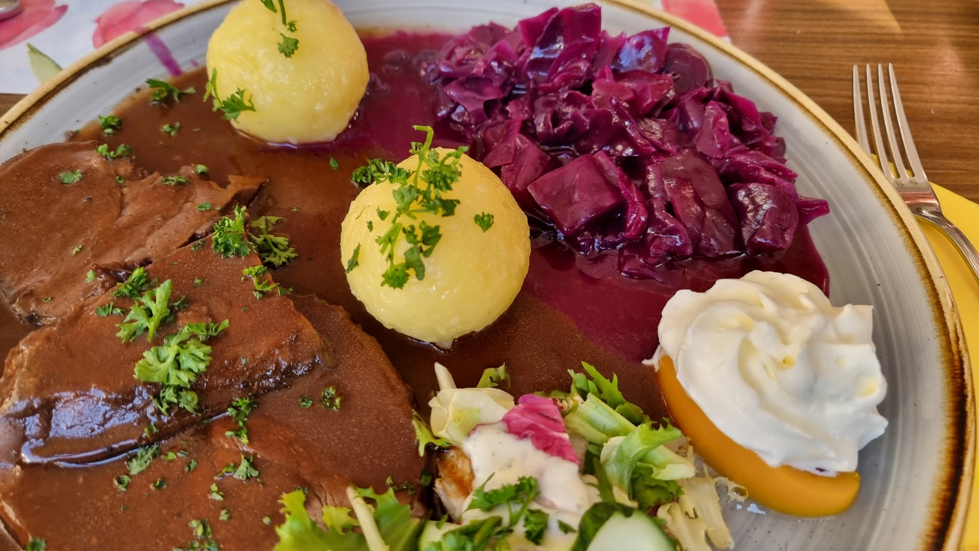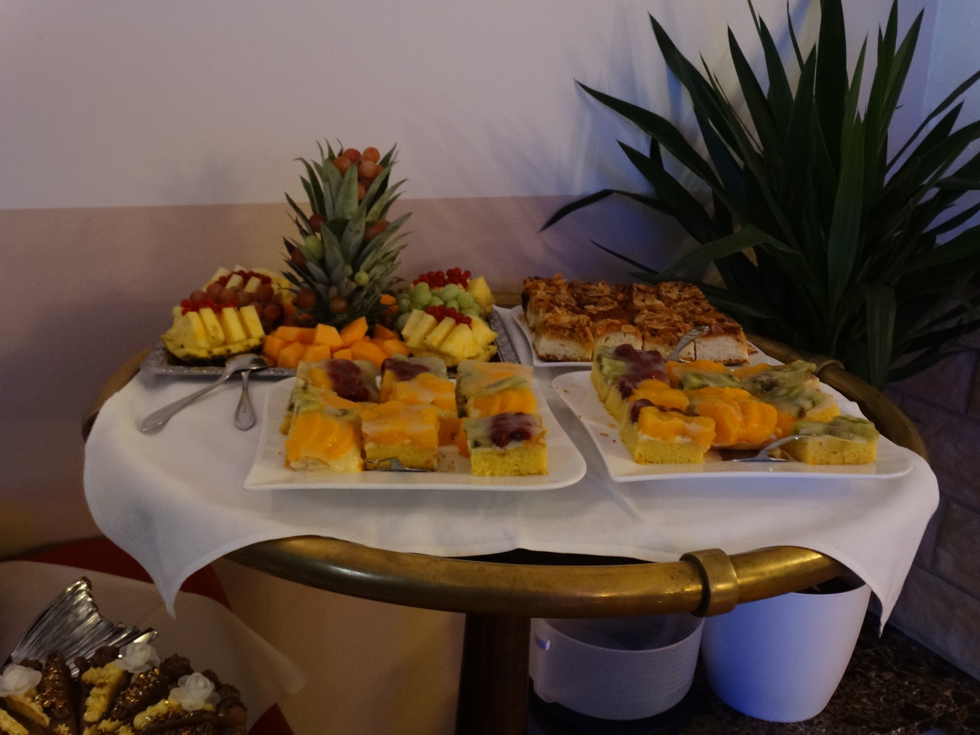 Als fast alle Essen bestellt hatten, fing es ganz plötzlich sehr zu regnen an, so dass die aussen Sitzenden nass wurden, also zogen einige wieder in "unseren" Raum. Einen kleinen Moment war die nette Serviererin beunruhigt, aber gemeinsam bekamen wir alles prima hin.