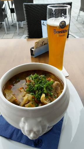 Als großer Freund von Bouillabaisse entdeckte ich auf der Karte die Fischsuppe in zwei Varianten: Als Vorspeise oder in der Terrine als Hauptspeise, letztere zu einem äußerst fairen Kurs von 8,50 €. Ich sage nur: Der Hammer! Die Terrine fasst geschätzt einen guten Liter und ist mehr Eintopf als Suppe. Einlage: Reichlich Gemüse und noch mehr Fisch. Mehr Fisch geht gar nicht. Sie wird täglich frisch zubereitet und bekommt das an Fisch, was da ist, also Seelachs, Dorsch, Rotbarsch und auch Lachs, teilweise mit Krabben als Topping. Jeden Tag anders und jeden Tag herausragend. Dazu wird ein frisches Baguette gereicht.