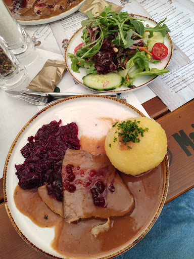 Getränke wurden schnell gebracht und auch auf das Essen mussten wir nicht lange warten. Wir hatten uns für Sauerbraten, Fränkische Bratwürste mit Kraut und Brot sowie für das Jägerschnitzel entschieden. Handwerklich gut gemacht, jedoch könnten die Portionen für mich ein klein wenig größer sein... für den Preis aber okay. Was leider nicht so schön war, weshalb ich hier auch etwas Abzug geben muss, ist dass mein Sauerbraten fast kalt war. Ärgerlich aber nach etwas Wartezeit bekam ich auf Nachfrage eine heiße Portion gebracht.