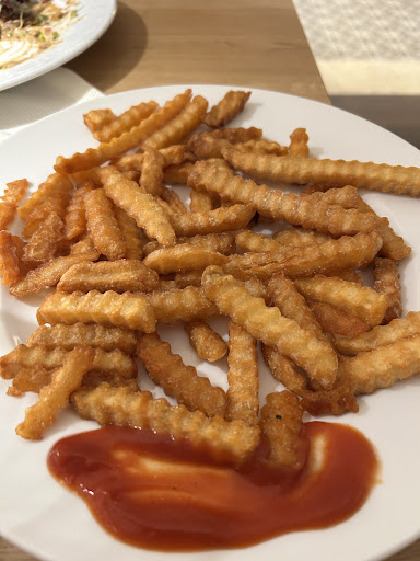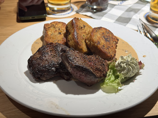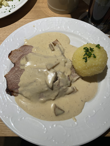 Read moreMan muss eins vorne weg sagen: das Ambiente und auch das Fleisch (Hat eine eigene Metzgerei) Ist wirklich gut und ansprechend. Was leider gar nicht geht, sind die Pommes. Diese kommen braun und zu stark frittiert an. Auf meine Nachfrage wurde mir gesagt, dass die Pommes vor frittiert werden und dann kurz vor der Ausgabe noch ein weiteres Mal frittiert werden. Das hat natürlich den Effekt, dass die Pommes nicht „rösch und knusprig“ (wie die Kellnerin es nannte) sind, sondern, dunkel, trocken und hart. Wie dunkel sie sind, kann man auf den beiden Bildern der zwei Portionen erkennen. Auch nach einer Reklamation bekam ich noch mal solche Pommes. „Das machen wir immer so“…. Spannend war auch, dass eine Bekannte ein Essen mit einem frischen Servietten/Semmel Knödel bestellt hatte. Auch dieses wurde von beiden Seiten in Fett angebraten. Wenn man ein frisches Knödel erwartet, erwartet man nicht ein angegebratenes. Auch hier wurde uns gesagt, das machen wir immer so.