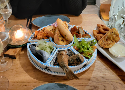 Das zweite Mal waren wir zum Abendessen dort. Platschnass von einem plötzlichen, heftigen Regenschauer bat man uns sofort und schnell ins gemütliche OG. Trotz unserer Nässe wurden wir sehr freundlich aufgenommen. Wier probierten verschiedene Vorspeisen und Hauptgerichte von der Karte - von klassisch Norddeutsch (Heringe) über einen Lachs-Reibekuchen-Burger ("für den kleinen Hunger", aber sehr gute Portion) bis Norddeutsch-Orientalisch ("1001 Nacht" und "Lust auf Meer"). Wir fanden alles sehr lecker und gut portioniert. Die Fusion Cuisine zwischen lokalem Fisch und orientalischen Gewürzen / Beilagen war sehr stimmig und gut (sogar mitunter ganz überraschend clever komponiert; etwas ganz anderes/neues). Einzigartig in SPO.