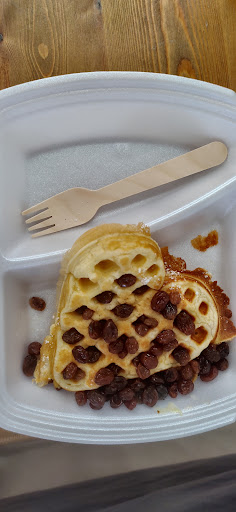 Read moreBei uns war auch das Phänomen das wir uns gewagt haben gleich um 12 anzutanzen. Die Dame hat auf meine Freundliche Frage hin ob die Terasse schon auf sei und ob man sich setzen dürfte,(da die Tische teilweise eingedeckt waren aber die Stühle noch hochgeklappt) pamt sie mich an ,das ich mich doch hinsetzen soll wo ich will. Fühlte mich doch gleich herzlich willkommen. Schade das ich meinem Fluchtinstinkt nicht gefolgt bin. Eine der Kinderwaffeln gab es nicht mehr. Und das bei Beginn des Tages! Wir Erwachsenen haben uns für zwei der herzhaften Varianten entschieden. Großer Fehler. Lediglich die drei kleinen Vollkorn Waffeln waren lecker und frisch. Die Soßen aus dem Eimer, der Lachs war ok....der Salat war mit einer widerlichen Balsamico Creme beträufelt. Eine Stunde später hab ich immer noch diesen Geschmack im Mund. Als wenn der schlecht gewesen wäre. Dann zu allem übel werden dann auch noch getrocknete Röstzwiebeln drüber gestreut. Die Kinderwaffeln waren groß und wirklich schmackhaft. Aber alles so lieblos. Wackel war, wie oben schon erwähnt, aus. Dann haben wir uns für die Kuhflecken und Mini Schokokuss entschieden. Bei der Schokokuss Waffel werden einfach drei kleine mini Schokoküsse dazu gestellt. Die Kuhflecken Waffel erklärt sich fast von selbst. Vanille und Schokoteig. Schön ist aber auch anders! Alles in allem eine Katastrophe für ein Lokal das "nur " Waffeln anbietet. Total lieblos und...