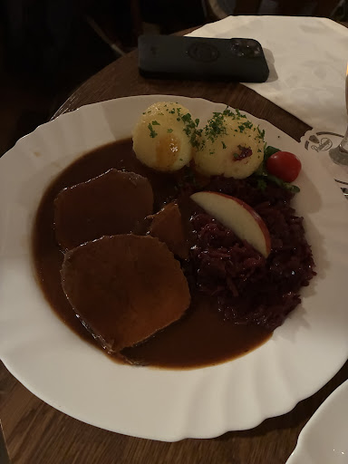 Essen: Der Thüringer Sauerbraten wird mit Apfelrotkohl und Klößen serviert. Ein klassisches, stimmiges Gesamtensemble in normaler Größe. Der Sauerbraten bringt selbst wenig Säure mit und ist einzeln ein wenig trocken. Da jedoch ausreichend Sauce vorhanden ist, stört das nicht weiter. Die Thüringer Rostbratwürste sind so wie man sie sich vorstellt: Säftig und würzig! Das Kartoffelpüree sehr üppig und cremig. Auf Wunsch wurde das Sauerkraut weggelassen.