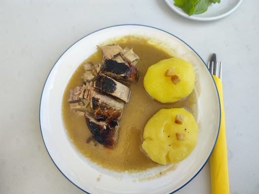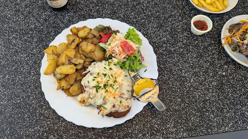 Read moreDie Hauptspeise, Roulade mit Kroketten, schmeckte mehr als langweilig. Die Soße war fade und schien für verschiedene Fleischgerichte angerührt worden zu sein. Es gab kein Rotkraut, dafür reichte man vorweg einen sehr leckeren, frischen Salatteller. Leider kann ich die angezeigten 4,5 Sterne nicht nachvollziehen, da scheinen viele Sympathie-Sterne vergeben...