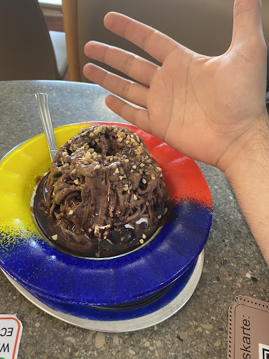 Read moreDie Kellner sind ein bunter Haufen. Mache super nett und manche super unverschämt. Manche von denen können nicht einmal richtig deutsch sprechen. Man kann auch nur Bar bezahlen und bekommt auch keine Rechnung mehr. Auch nicht mehr nach dem bezahlen. Ziemlich veraltete Denkweise.m und nicht zeitgemäß, dass man mit Karte und co nicht bezahlen kann. Die Portionen sind auch geschrumpft bei stetig steigenden Preisen. Haben ein Spaghettieis bestellt, es ist etwa um die Hälfte kleiner geworden und 2€ teurer. Die haben außerdem den klassischen Spaghettieis, was früher mit Erdbeeren verkauft wurde, in zwei verschiedene Sorten aufgeteilt. Einfach nur zum Kopf schütteln. Hier ist ein Beispiel von der aktuellen Größe ihres Spaghettieises. Das hat nichts mehr mit Inflation oder steigenden Energiepreisen zu tun. Das ist pure abzocke greedflation. Deswegen gehe ich da auch nicht mehr so oft...