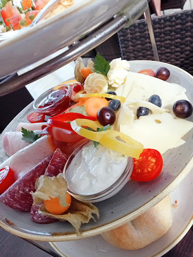 Read moreWir waren mit einer größeren Gruppe (10 Personen) zu einem Geburtstagsbrunch hier. Wir haben drei Etagerien bekommen, die mit verschiedenen Aufschnittsorten, Aufstrich, Marmelad, Käse, Obst und Gemüse (inkl. Tomate/Mozzarella) gefüllt waren. Da wird auch Veganer unter uns hatten, war eine Etagerie komplett für diesen Personenkreis🤩. Es war wirklich alles in ausreichender Menge vorhanden und wir sind sehr gute Esser. Ein paar Brotscheiben und Brötchen haben wir noch problemlos nachbestellen können, weil wir auch wirklich alles aufessen wollten (ist uns aber nicht gelungen). Man sitzt hier wirklich schön, in einer Art Wintergarten und das ist auch der Grund für den Sternabzug, denn es war einfach zu heiß. Leider wollen die anderen Gäste nicht, das man die Tür öffnet (Allergie und Zug) und dadurch haben wir sehr geschwitzt, was es etwas ungemütlich gemacht hat und leider auch dazu geführt hat, dass wird unseren Kaffee/Tee nicht wirklich genießen konnten. Ansonsten ist es wirklich sehr schön, die Angestellten sind sehr freundlich und das Frühstück ist Top. Wir werden auf jeden Fall wieder kommen, allerdings entweder im Winter oder wenn es draußen waren genug ist, damit man auf der Terrasse...