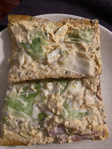 Als der Croque gebracht wurde, habe ich auch nicht nochmal nachgehakt, hatte ja was im Auto. Knoblauchsauce extra hab ich auf meinem Nachfragen umsonst bekommen. Am Auto zurück, Parkplatz war ca.20m entfernt, wieder im Croque reingebissen. Auch wieder nur lauwarm, aber diesmal ohne Salami. Mozzarella noch nicht mal ansatzweise zerlaufen. Die Scheiben hätte man so runternehmen können. Die Knoblauchsauce war mit dem Weisskohl vermischt, als ob dieser vom alten Croque runtergenommen wurde.