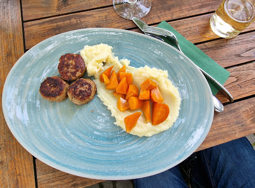 Wir hatten uns dann fast alle entschlossen dort nicht zu Speisen, da aber ein Kind starken Hunger hatte, hatten wir die Kinderportion Frikadellen mit Kartoffelpürre und Karotten bestellt, meine Frau ein Salat, damit das Kind nicht alleine Essen muss. Das Essen ging dann relativ schnell. Leider waren die Frikadellen nicht sehr schmackhaft für Kalbsfrikadellen, Sorry aber es hätten auch Geflügelfrikadellen aus der Packung sein können. Kartoffelpürre war gut, der Salat meiner Frau war auch gut und hat eine gewisse Note durch das raffiniert abgestimmte Dressing erhalten, hier gab es kein Kritikpunkt.
