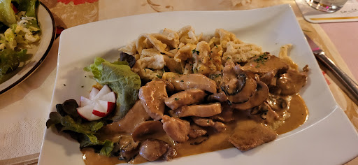 Mein absolutes Lieblingsgericht ist das Geschnetzelte vom Schwein. Es wird vom Filet zubereitet und hat zum Zeitpunkt des Servierens stets den perfekten Garpunkt. Serviert wird es in einer super leckeren und überhaupt nicht überwürzten sondern natürlich schmeckenden Champignonrahmsoße neben (nicht auf!) den hausgemachten Spätzle auf einem stets gut warmen Teller. Auch die hausgemachten Spätzle sind so wie sie sein müssen. Vor dem Servieren werden sie noch einmal ganz kurz (in Butter?) „angebraten“, sodass teilweise ganz dezente Röstaromen entstehen. Sowas macht nur, wer liebt, was er macht. Spätzle und Geschnetzeltes kann man dann je nach Gusto zusammen oder getrennt essen - so muss das! Der Salat ist immer frisch und knackig und bietet einen schönen Kontrast zu dem herzhaften Fleisch. Ich wüsste nicht, was man an diesem Gericht noch perfektionieren könnte!