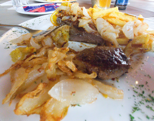 This is a beautiful restaurant with a fantastic menu. When we entered we sat in the first front section inside, the chairs were really comfortable, the coffee I ordered came quickly and was delicious. However, after ordering the rest of the drinks we had to move tables as the light above us was flickering. This is dangerous for anyone who has epilepsy. We moved inside as far away from the flickering light as we could. The salad was fresh, really tasty and there was olive oil available. (Always a plus!) The service was great and although one waiter didn't reply in English he understood perfectly. When I used the toilet, I didn't need to ask for directions, the waitress spotted me immediately as I walked through and offered the information. (I noted that all the staff did this, seemingly reading the minds of customers) great service. One toilet was out of order in the ladies, but the other was functional and clean. Cigarettes were on sale from a vending machine. We all ordered the Schnitzel. Pepper sauces and mushroom. The sauces were in large portions and exceptional quality. It came with an ample portion of chips which were crispy and delicious. I would definitely go back there. My only problem was with the light flickering, which can cause epileptic seizure, but the rest?...