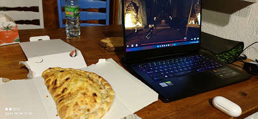 Ich denke die Alu Schale wurde befüllt und im Pizza Ofen so lange überbacken, bis Käse und Fleisch garantiert keine Feuchtigkeit mehr enthalten konnten. Vor Lieferung an mich dann noch Salat-Blätter und Tomate oben auf und - ab zu mir.