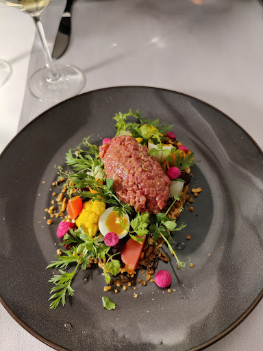 Wir bestellten als Vorspeise das Rindertatar, was toll angerichtet daherkam, mit raffinierten Komponenten von gepickelten Gemüse und Crumble unterstützt worden war. Was hier m.E. nicht so ganz passt ist die doch sehr süße Aprikosencreme, die relativ dominant das Tatar begleitet bzw. eher "übertüncht" hat. Die Menge der Creme im Verhältnis zu den anderen Komponenten war zu hoch, sodass die Proportionen nicht stimmten. Die Masse ist m.E. zu süß für das doch sehr zarte Rindertatar, da durch die Creme die Balance zwischen Säure, Herzhaftigkeit und Süße fehlte, vielmehr das Gericht insgesamt sehr süß wird. Dennoch insgesamt ein sehr schönes Gericht.