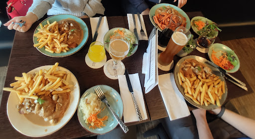 Read moreEssen ist echt super und man hat eine grosse Auswahl. Allerdings waren wir beim zweiten Besuch nicht zufrieden. Es waren zwei Bedienungen gleichzeitig und das ist bzgl Abstimmung nicht optimal weil jeder ständig fragt ob man zufrieden ist und ob man noch was will. Übermässig freundlich sein ist ja ok, aber in Summe hat das etwas genervt beim 5. Mal innerhalb kurzer Zeit fragen ob alles ok ist usw. Ich hatte ein grosses Bier bestellt und die Bedienung brachte ein kleines (was eigentlich kein Problem ist) aber die ältere Bedienung wusste beim kommen schon dass es falsche war es war ihr aber egal und sie hat das Glas hingestellt und nur festgestellt dass ein Fehler passiert ist und gar nicht gefragt ob mir das recht ist. Wenn ich weiss dass ich was falsches bringe dann korrigieren ich das schon vorher. Wäre hier einfach möglich gewesen...Würde ich eigentlich nicht erwähnen, passt aber zum Gesamtbild. Kaum war der Salat nach 3 Minuten auf dem Tisch, kam auch schon die Hauptspeise 2 Minuten später. Die wurde dann wieder mitgenommen nachdem wir uns beschwert hatten. Man hat sich eher so gefühlt als ob man schnell fertig sein soll damit der Tisch nochmal vergeben werden kann. Wir haben bezahlt und sind dann noch 2 Minuten sitzen geblieben und schon war wieder jemand da und hat gefragt, ob sie die Gläser mitnehmen könne. Das ist nicht professionell und wir haben das dann auch gesagt. Bedienung war zwar oberflächlich freundlich, Entschuldigung kam auch keine und man hat gemerkt, dass das freundlich sein nicht ehrlich gemeint war. Hat man auch gemerkt als wir runter gingen und die etwas ältere Bedienung augenscheinlich mit der Kollegin darüber gesprochen hat. Fazit: wir gehen nicht mehr hin. Wir haben uns nicht gut...