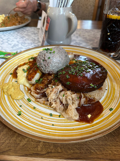 Essen: Da man das nicht so oft bekommt, habe ich mich für den Kurpfälzer Teller als lokale Spezialität entschieden. In der Hauptrolle waren Saumagen, Leberknödel und eine Bratwurst, welche von Sauerkraut und Kartoffelpüree begleitet wurden. Dazu eine schöne braune Soße. Mir hat wirklich jede einzelne Komponente sehr gut geschmeckt. Ich hatte sowieso schon Hunger, habe aber während dem Essen noch mehr Appetit bekommen. Das war wirklich Essen das glücklich macht. Das Bild sollte alle Fragen klären. - 5/5