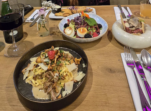Geschmacklich alles gut, das Steak war noch bisschen sehr roh Tatar super, vor allem die Trüffelmayo César Salat geschmacklich gut, auch auf den Extrawunsch mit Dressing wurde eingegangen, nur das Topping des Salats - die Hendlbeilage für die 3 Salate in einer Box zu reichen, das war eine Mini Portion.... geteilt auf die 3 Salate das war sehr klein bemessen. Burger geschmacklich auch gut, bei einem Burger war das Patty innen noch sehr roh Da sollte gerade wenn es für Kinder/Jugendliche ist vielleicht gesagt werden dassman es durch möchte. Beilage Pommes im Country Style, war auch gut. Im Großen und Ganzen viel Potenzial, tolle Räumlichkeiten und nette Ideen in der Karte und beim anrichten der Speisen Aber: Es fehlt diese Herzlichkeit und Wärme und auch wenn mal was nicht so opti läuft, wir sind ja alles nur Menschen und keine Roboter, Fehler passieren, bisschen mehr Emotion und Feinfühligkeit, Gespür für den Gast, wenn man die Arbeit liebt dann merkt das auch der Kunde.