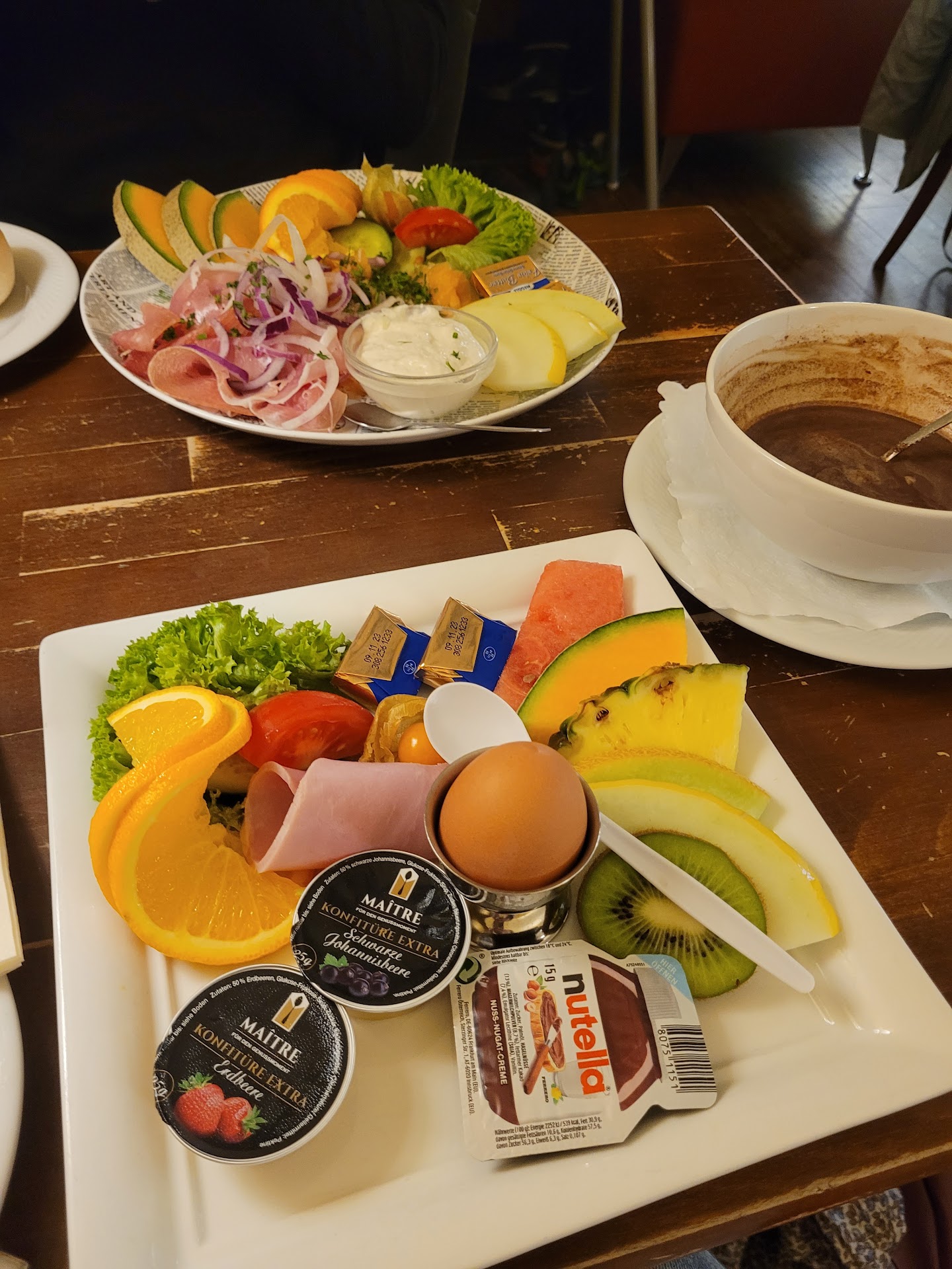 Das Frühstück kam mit Kochschinken. Es war an sich schön angerichtet. Leider hatten wir durch die mündlichen Empfehlungen hohe Erwartungen. Dass die Konfitüre in der Plastikverpackung kam, war nicht sehr schön. Ich selbst arbeitete in einer kleinen Bäckerei mit einer Filiale. Selbst wir hatten schöne kleine Glasschalen, in der wir Marmelade anrichteten.