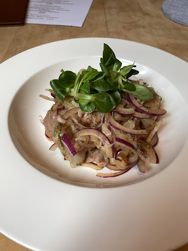 Als Vorspeise habe ich mich für die Ceviche vom Skrei mit roten Zwiebeln, Chili, Limette und Koriander entschieden. Dass es davon auch eine „à la Tapa“ Version gibt, war entweder aus der eingeschweißten „Vor-Ort-Karte“ nicht ersichtlich, oder ich habe es übersehen. Leider wurde ich auch nicht darauf hingewiesen, denn die große Portion bereitete mir nur eingeschränktes Vergnügen. Schon wegen des niedrigen Preises (14,90 €) hätte ich nicht mit dieser Menge gerechnet. Erwartet hätte ich einige marinierte Stücke aus dem Loin, bekommen habe ich zahlreiche Abschnitte, begraben unter einem Berg von Zwiebeln.