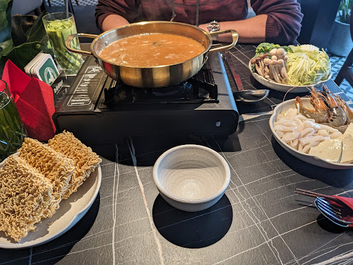 So lief das Hot Pot ab: Als erstes wurde uns ein Gaskocher auf den Tisch gestellt. Dazu kamen auf Tellern und Schüsseln die einzelnen Zutaten. Zusätzlich bekam jeder eine kleine Schüssel, mit der man sich die Portionen selbst zusammenstellen konnte. Wir hatten erst bedenken, dass ein kleiner Tisch für zwei Personen beim Hot Pot reicht, allerdings war es gut aufgeteilt. Nachdem die Zutaten da waren, kam die heiße Brühe. Wir haben die Kokos Thai Variante gewählt. Uns wurde der Gaskocher eingestellt und es wurde uns eine kleine Einführung über die Garzeiten der Zutaten gegeben. Geschmacklich war das Hot Pot eine tolle Erfahrung. Die Brühe war leicht scharf, aber nur sehr dezent. Trotzdem sehr geschmacksintensiv. Die Zutaten waren frisch und ausreichend für zwei Personen. Selbst für drei Personen, wenn man sich vielleicht noch kleine Gerichte dazu bestellt, reicht es eigentlich locker.