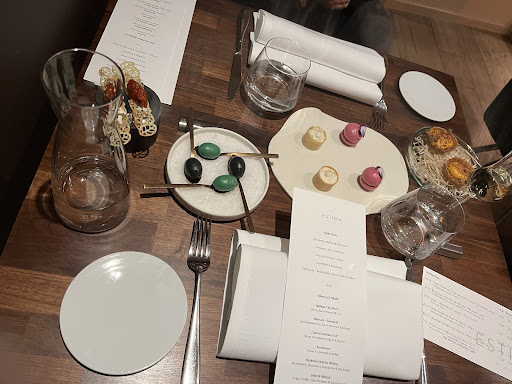 Ein Besuch im Estima by Catalana zieht einen anderen nach sich. So geht es dem Unterzeichner seit Jan Hendrik Feldners Debut Mitte der 2000er mit seinem Catalana am Mainzerhofplatz. Heute mit Termin und Menü. 7 Gänge stehen zur Verfügung, 5 Optionen ziehen wir. Hinzu kommen noch unverzeichnete Amuse gueules, die vielversprechend aussehen und auch so duften. Chef Sebastian Ernst arrangiert diese, ebenso wie später die Gänge des Menus, liebevoll zu kleinen Kunstwerken. Dabei kann der Gast vom Platz aus zusehen. Im Ablauf wird der perfekt gegarte Hauptdarsteller jedes Menuabschnitts der Steinbutt, das Huhn, das Schweinefleisch, die Jacobsmuschel, nach dem vorstehend beschriebenen Arrangement dem Gast vorgestellt. Die anschließend von Ernst angegossenen Espumas, Sösschen, Reduktionen brennen darüber noch ein Aromenfeuerwerk ab. Dieses Mal fiel unsere Wahl auf die fleischhaltige Menu Variante, vorige Woche war und Wochendende wird das vegetarische Menu aktuell sein. Aber eines ist bei all dem verdienten Lob vergessen. Lieben Dank an einen genialen Sebastian Ernst an eine - wie immer - charmante und so freundliche Oberkellnerin Huan (stimmt das?) mit ihrem Team.