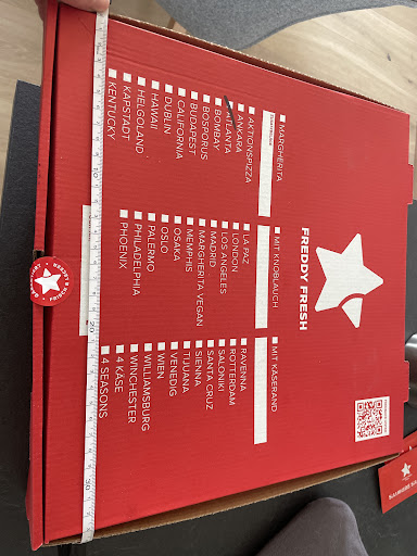 Read moreWir bestellen nicht häufig aber gerne bei Freddy Fresh. Diesmal hat es ungewohnt lange gedauert (90min), was überhaupt nicht schlimm ist. Uns wurden aber leider bei der Bestellung zwei kleine Pizzen geschickt statt eine in Größe 25cm small und eine in 27cm Medium. Wir wollten echt nicht penibel sein, aber fast 4€ zahlt man mehr für eine Medium Pizza. Deswegen haben wir angerufen und telefonisch wurden wir sehr freundlich empfangen. (Ich war mir selber unsicher ob ich einfach zu kleinlich bin und hab deswegen nachgemessen, 25,5 cm an der längsten stelle) Ohne Umschweife wurde uns aber eine neue Lieferung zugesprochen, die diesmal deutlich mehr an die Medium 27cm ran kamen. Vielen Dank dafür! Eure Aktionspizza Nikolaus ist wirklich echt gut, kann ich nur empfehlen! Preis-Leistung sorgt nur leider dafür, dass ich einen Stern abziehe. Es wäre vielleicht besser die Größe Medium auf 28-29 cm zu erhöhen bei fast 4€ mehr. Ich hoffe, dass die Pizza im Austausch bei euch nicht weggeschmissen wurde sondern ihr sie zusammen...