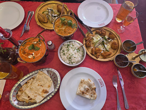 I went with my friends to this restaurant for lunch. We were welcomed, and the restaurant looked amazing with a lot of Indian themes and the toilet was very clean. We were people with 2 kids, and we also got a high chair for both. As drinks, we ordered Mango lassi, which was the best we had from there. SO the hopes for the food were high. We ordered lamb vindaloo, tandoori chicken, chicken tikka masala, panner mutter, chicken ghee, Bombay biriyani, and chicken biriyani. Every main course came with rice and a naan. Lamb vindaloo wasn't spicy and lacked flavors, chicken tikka masala, mutter paneer, and chicken ghee were just ok. Both the biriyani were a flop, chicken biriyani tasted like chicken khichdi and Bombay biriyani was like Spanish paella which had all meat, still khichdi. Usually, biriyani comes with a raitha, and there is no raitha or salad for the biriyanis. when we asked for one, they charged 4€ for the raitha. The tandoori chicken was presented the best in the sizzling pan but was the worst, there was no flavor at all, just red-colored chicken. The vegetables that came on the side of tandoori chicken were not fresh, and when we complained, the waiter said, "We cut those in the morning." They didn't even replace it with some fresh veggies. In short, we would not go back here again as the food was not...