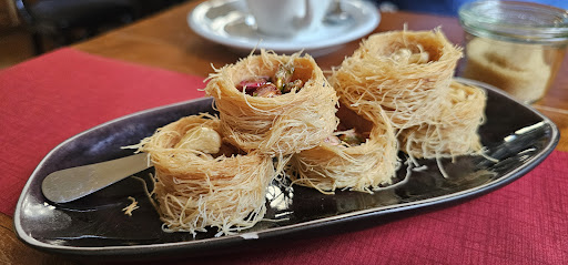 Read moreBin beim Schlendern, am roten Elephant vorbeigekommen. Das Restaurant, seine Speisenauswahl (es gibt auch viele vegane Gerichte) sprachen mich von außen bereits an. Dennoch ging ich weiter. Nach der Besichtigung konservativer Alternativen bin ich dann umgekehrt, folgte meinem Instinkt, oder seiner magischen Anziehung und trat ein. Weil im sehr offen, ansprechend eingerichteten Gastraum bereits vor 18:00 alles voll und ausreserviert war, bat man mich freundlich in den ersten Stock. Die Räumlichkeit auch hier super ansprechend. Ich habe mich für Taboulé Salat entschieden, der einfach umwerfend gut, sowohl geschmacklich als auch optisch fantastisch und alles frisch zubereitet war und mich an das syrische Original erinnert hat, denn erstmalig lernte ich Taboulé bei Geflüchteten kennen. Der vegane Elephantenteller war dann geschmacklich und optisch ein beinahe unfassbares Erlebnis. Er zwang mich innezuhalten und zu genießen. Wundervoll! Auch die Kuchen sind (Vorsicht!) suchterzeugend! Die meisten arabischen Restaurants, die ich bisher kennenlernte und auch gut sind, können dem Elephanten nicht das Wasser reichen. Das Personal offen und sehr gut aufgelegt, kümmert sich spürbar um das Wohl der Gäste, berät gut und alle sind super freundliche Menschen, die offensichtlich stressfrei immer den Überblichck behalten. So wusste ich bereits am zweiten Tag, wo ich zum Essen hingehen werde und konnte so meinen ersten Eindruck nochmals (bei anderem Bedienpersonal) verifizieren. Ich kann den Roten Elephant mit bestem Gewissen atmosphärisch, optisch, hygienisch und geschmacklich nur allerbestens...