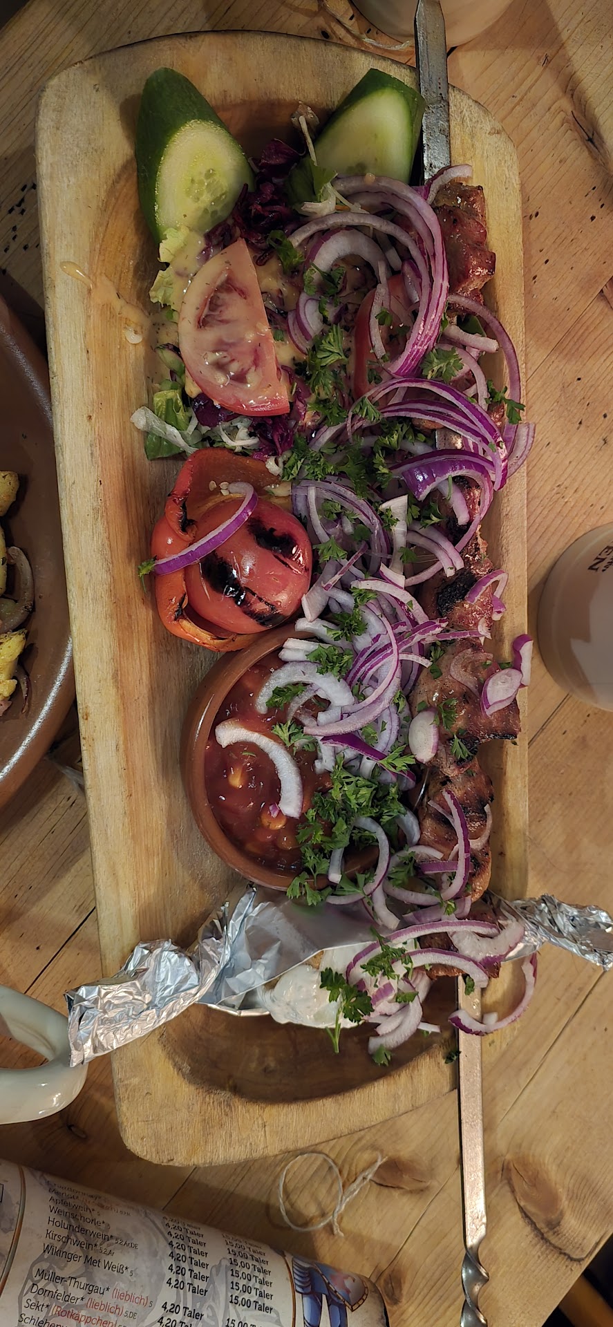 I went there with a colleague of mine while on business trip. The first time we attempted to go there was 1 hour queue and we left. The next day we went a couple of hours earlier and we found at once place to sit. The place is nice and the atmosphere is medieval. The same applies for the clothes of the people that work there and the music. We had issues ordering as there was no English menu and when the server came and understood that we were not speaking German he did not call someone to assist us with ordering. I was lucky enough and I took something I happened to like. My colleague's choice did not seem so nice and he found it so and so. To be fair many dishes that we saw on other tables seemed great and interesting. Only when we finished eating and drinking and asked for the bill an employee that was speaking English appeared to ask us if everything was ok... All in all the place was interesting but you need to either go early or make a reservation to be sure you ll find a table to sit. Moreover if you do not know German make sure you know in advance what you want to take by checking an online menu or some other way otherwise there is a good chance noone will assist you from...