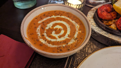 Hier waren wir zum 1. Mal am Freitag Abend. Das Restaurant war ausgebucht, wir wurden sehr freundlich empfangen und zu unserem Tisch geleitet. Die Getränkebestellung wurde in kürzester Zeit aufgenommen und der Aperitif erreichte uns auch so dann. Da mir die Indische Küche sehr ans Herz gewachsen ist wollte ich einen möglichst großen Überblick der angebotenen Speisen erhalten. Hierzu gerne einen Rheingau Riesling genießen, da dieser meiner Meinung nach den meisten Geschmacksnuancen standhalten kann. Hier bot uns der sehr freundliche und umsichtige Service Mitarbeiter, auch die Möglichkeit diesen als Flasche zu verzehren, an. Die ausgewählten Speisen führten uns über frittietes Hähnchenfilet, Kichererbsensalat und ein Gemüsebällchen mit herzhaftem Minzdipp, über einen wahsinnig cremigen Dal Makhani von schwarzen Linsen der so butterig zart den Gaumen umschloss, das man die Tiefe des Geschmacks nicht mehr verlieren wollte. Weiter ging die Reise über einen phänomenalen Paneer in Tomaten Butter Masala..der gereichte Basmati war von feiner Struktur, zart und auf den Punkt gegart. Die Indische "Grillplatte" mit Lamm Palak, Chicken Tandoori und Garnelen war sehr saftig und auf den Punkt gegart. Als weiteren Hauptgang gab es ein Chicken Biryani. Das Fleisch war super mariniert, zart und auf den Punkt gegart. Der Biryani Reis war perfekt gegart und geschmacklich ausgewogen. Persönlich fand ich das Gericht etwas zu trocken, da ich das Chicken mit Biryani Sauce kenne und somit der Reis oben auf etwas mehr " Saftigkeit " vertragen kann. Das wie gesagt meine persönliche Meinung. Wir waren so geflasht von der Vielzahl der tollen Geschmacksnuancen..traumhaft. Nach dieser Menge waren wir zum Platzen gefüllt. Der tolle Servicemitarbeiter brachte uns Aufgrund des Anlasses noch ein Dessertteller.... hier erreichten wir unsere Füll Grenze und überschritten diese. Zum Abschluss nahmen wir noch einen Espresso und ich hatte noch das Vergnügen einen indischen Rum als Digestif. Superlecker! Preis Leistung sind hier auch sehr passabel. Dies war auf jeden Fall nicht unser letzter...