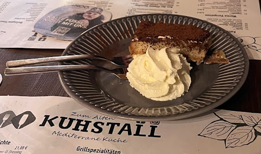Als wir am Montagabend spontan etwas zu feiern hatten und all unsere Lieblingsrestaurants geschlossen hatten, stießen wir bei Google auf den alten Kuhstall und reservierten spontan noch einen Tisch im wunderschönen, geöffneten Wintergarten. Wir wurden sehr freundlich begrüßt und schnell bedient. Die Getränke kamen schon nach 5 Minuten und wir bestellten 2 Grillteller mit kleinen Salaten. Die Atmosphäre war sehr angenehm, die Tische ungewöhnlich groß und der Geräuschpegel für ein ruhiges Gespräch perfekt leise. Wir fühlten uns sofort sehr wohl. Zu unseren Salaten, mit dem besten Senfdressing, dass wir je gegessen haben, wurden leckere frische Brotscheiben mit Kräuterbutter, Olivenöl und Oliven serviert. Ein absoluter Genuss, der nur noch von den beiden zügig servierten Grilltellern übertrumpft wurde. Das Fleisch war butterzart und lecker gewürzt, hier schmeckte man sofort die herausragende Qualität. Die Pommes und die Rosmarinkartoffeln waren ebenfalls ein Gedicht und sind absolut zu empfehlen. Für uns war es ein absolut überraschend perfekter Abend, den wir sehr gerne zeitnah...