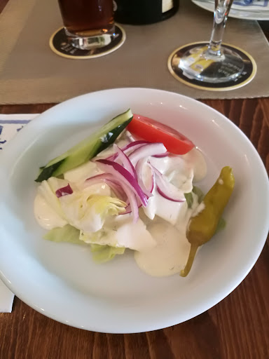 Bei meiner Ankunft waren fast alle Parkplätze auf dem Hof des Restaurants belegt und ich befürchtete eine längere Wartezeit, welches sich zum Glück nicht bestätigte. Das Restaurant war erstaunlich leer, aber nichts desto trotz stand ich einige Zeit im Eingangsbereich vor der Theke. Der dort arbeitende junge Mann bemerkte mich zwar, aber ignorierte mich gekonnt. Also bin ich selbst auf Tischsuche gegangen und habe am einen Tisch in der Ecke Platz genommen. Auch die eifrig umherlaufenden Kellner schienen mich nicht zu bemerken, aber nach ca. 2 Minuten stand dann eine der 3 an meinem Tisch und reichte mir die Speisenkarte. Das Angebot ist nahezu identisch mit vergleichbaren griechischen Restaurants, die Preise sind durchschnittlich. Nach kurzer Wartezeit kam das bestellte Knoblauchbrot und der Salat. Eisbergsalat, ein grob geschnittenes Stück Gurke, eine Scheibe Tomate, ein paar Zwiebelstücke und eine Peperoni - übergossen mit Joghurt Dressing. Nach etwa 10 Minuten kam auch das Hauptgericht (Nummer 61 auf der Karte). Die Pommes waren zu lange in der Fritöse und keine Gastronomie Qualität. Das Gyros passte samt der reichlich vorhandenen Zwiebeln auf 8 Gabeln und war hauchdünn wie ein Döner geschnitten. Auch der Geschmack konnte mich nicht überzeugen. Das restliche Fleisch war von Geschmack besser, aber auch nicht die beste Qualität.