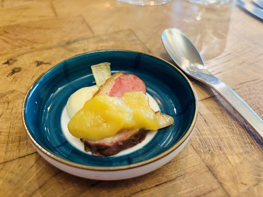 Michelin-Star Preise aber weder Service noch Essen konnten überzeugen. Bei einem Preis von 65€ für ein 3-Gangmenü (75€ für 4 Gänge) kann man schon mal etwas erwarten. Zum Vergleich, in London bezahlt man für 3 Gänge 35£ oder 4 Gänge 45£ in einem Michelin-Star Restaurant (Stand Ostern 2022). Es gibt nur 2 Menüs, aber die einzelnen Gänge können ausgetauscht werden. Keine vegetarischen Optionen als Hauptgang sind verfügbar. Vorspeise (Vitello tonnato) war gut aber es fehlte Salz. Salz und Pfeffer waren auf dem Tisch, was man in keinem fine-dining Restaurant in London vorfindet. Sagt sehr viel über die Kompetenz des Kochs. Hauptgang war Kalb mit Trüffel mit 3 winzigen Gnocchi. Ich musste nach Brot nachfragen und Butter gab es auch nicht. Ein extra Brotteller und Brotmesser waren auch nicht vorhanden. Die Servietten waren aus Papier, absolutes No-Go wenn man vorgibt fine-dining anzubieten. Der Service fragte nie ob wir noch Brot möchten. Die Wartezeiten zwischen den Gängen waren viel zu lang. Wir warteten mind. 30 min auf unser Dessert, nur ein Soufflé oder Schokolodenfondant würde diese Wartezeit rechtfertigen. Es war auch auf der Karte nicht beschrieben was die Nachspeise sein soll. Der Service fragte an diesem Punkt auch nicht ob wir irgendwelche Allergien oder Unverträglichkeiten haben. Das Dessert wurde serviert und wieder wurde nicht gesagt, was es ist. Das einzig interessante an dem Dessert war das Basilikumsorbet. Der Rest war unterer Durchschnitt. Irgendetwas geschmackloses Gebackenes mit irgendeiner geschmacklosen Creme auf Rhabarberkompott. Als Beilage waren Erdbeerscheiben auf dem Teller, die nach Zwiebeln geschmeckt haben. Das war der Höhepunkt des Abends, woran man sieht, dass der Koch nicht weiß, dass man Erbeeren nicht mit dem Zwiebelmesser schneidet. Er schneidet wahrscheinlich auch den Salat auf dem Brett, wo er gerade rohes Fleisch geschnitten hat. Service existierte nicht, da wir uns unser Wasser und Wein selbst eingießen mussten. Es wäre billiger gewesen, direkt nach London zu fliegen, um Essen zu gehen. Dort bekommt man exzellenten Service und herausragendes Essen für viel weniger Geld. Diese Art von Restaurant funktioniert nur in einem Dorf wie Erlangen, wo niemand weiß was gutes Essen und guter...