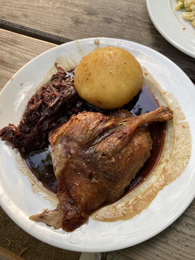 Ich hatte mir die ¼ Ente mit Blaukraut und Knödel bestellt. Optisch sah das Ganze sehr gut und ansprechend aus. Ich hatte große Erwartungen, auch aufgrund des hohen Preises von knapp 15€. Leider wurde ich enttäuscht. Die Entenhaut war labberig und nicht knusprig, das Fleisch trocken und lauwarm bis kalt, das Knödel verkocht. Mein Mann hatte das ½ Hähnchen - dieses war zwar heiß, aber irgendwie nicht richtig durch, noch etwas glasig. Der Kartoffelsalat war immerhin ganz gut. Das Hähnchen hat glaub ich so 13€ gekostet, das hab ich mir nicht gemerkt. Wir hatten die o.g. Speisen + extra Pommes und haben um die 30€ gezahlt - dafür erwarte ich gutes Essen und keine Enttäuschung. Wirklich schade. Letztes Jahr hat uns das Essen auch nicht getaugt, wir dachten, dass wir es nochmal probieren...das nächste Mal werde ich das Geld anderweitig ausgeben oder wir bringen selbst eine...