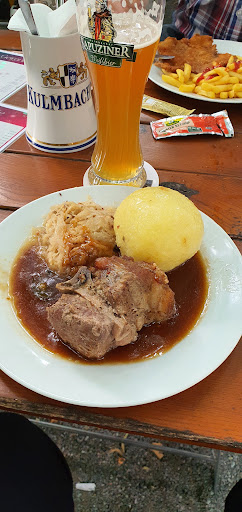 Ja - es ist 1schöner, schattigenr Biergarten. Und toll, dass es ihn gibt, aber es geht sehr chaotisch zu. Man sollte Zeit mitnehmen...und die Lust darauf sich anzustellen. Weil das dauerte gestern ziemlich lange.Und essenstechnisch noch länger, und das Essen kam ewig nicht und es wurde 2 mal nachgefragt was denn noch fehle. Die armen Mädels ! Ist sicherlich ein absoluter NachCoronaNeuAnfang und deswegen sollte man nachsichtig sein und einfach eine Einarbeitungszeit gewähren...bis es besser klappt mit der Organisation. Das Salatdressing beim Austernpilzsalat war leider sehr fade. Der Kloss mit Soss hat gepasst. Die Gambas sahen MEGA aus auf dem Salat vom Nachbarn...denke wegen dem KnoblauchazitroneZusatz wird da mehr Geschmack gewesen sein. Aber wenn nach Stunden ein Drittel der Essensbestellung endlich kommt, und das ohne Besteck, dann ist es 1 MegaNoGo, wenn es nicht sofort nachgeliefert wird. Das Besteck sollte lieber schon lange vor oder mit dem.Essen ausgeteilt werden, oder aber Bierkrüge zum auf die Tische stellen vorbereiten wäre von Vorteil. Oder aber man lässt die Leute das Besteck selber mit nehmen. So wie auf der Skihütte, wo auch SelbstBedienung herrscht ! Es muss bei gut besuchten Biergarten einfach alles etwas besser klappen. Die Küche ist dort sicherlich viel zu klein gewesen, für den Anlauf gestern. Auf jeden Fall haben die Angestellten Ruhe bewahrt und bestimmt ihr Möglichstes gegeben. Ist schwer am Anfang, wenn alles NEU ist. Bzw der Ansturm. Auf jeden Fall "Viel Glück & Alles Gute für die Zukunft !" Man darf bei sowas nicht zuviel meckern. Man darf froh sein, dass der Laden offen hat und das Einspielen braucht eben .... Wenn man schneller essen will, dann sollte man sich in die...