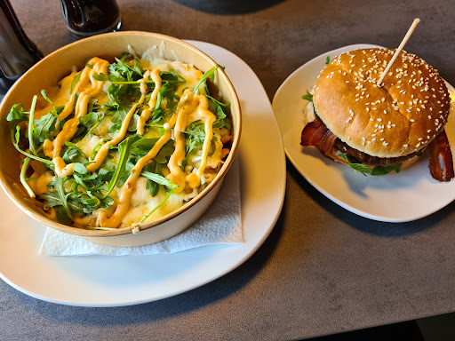 Sternabzüge: Vom bestellen bis der Burger an den Tisch gebracht worden ist. Ist eine gute Stunde vergangen. Die Küche hätte die Chili Cheese Fries in eine "Zum Mitnehmbox" zubereitet und musste das wohl noch einmal ändern.