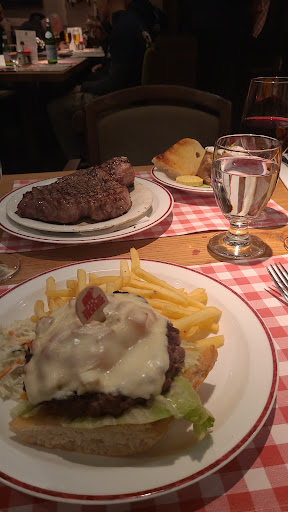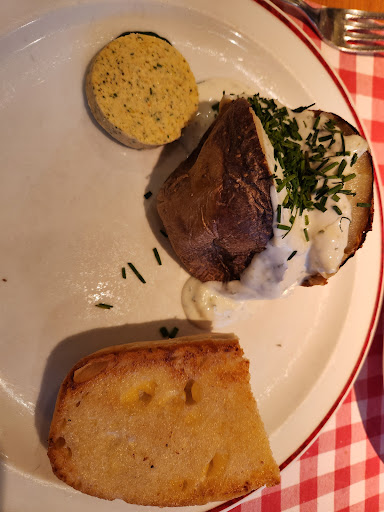 I actually came to this restaurant because of its rating, but I would have to think that people have been a bit kind in their rating of this location (chain restaurant?). We were greeted kindly at the front door and were certainly looking forward to a meal out of the rain while at the Christmas Market. The salad bar is right at the entrance, everyone walking by it, and I thought it a bit strange that people do not make their own salad. Maybe it was an all-you-can-eat salad bar at one time, but waiters/waitresses make your salad in this area and bring it to you (???). The salad was good and our meal was quick to follow. We ordered the T-Bone steak for two (asked for Medium Rare cook). Each person gets a plate with their sides on it, and the steak is on another plate. This is where things started to turn for the worse. The presentation was terrible - literally a steak on a plate (see pic). I paid for one of the biggest items and this is how it comes out? This was the least of my concerns. Next was the simple fact that the T-Bone steak did not have a T-Bone?!?!?! The waiter actually tries to tell me to picture the bone and how meat located in each area would be different. I did not pay for imagination. Next was the cook. The outside of the "Strip" was about right for 1/2inch. After that it went downhill. I'm not sure how the heat is on the grill, but the rest of the steak was rare to almost Blue (especially near the bone and the "Tenderloin" portion. My last concern was the amount of sinew through the steak. I could literally not cut it in some spots due to the mess (from lacking the bone?). All I can say is that I have had many steaks in my days, and this was one of the worst I have had. I will end on a positive note that the taste was actually very good where prepared properly, and they did remove the cost of our two drinks for the mess of our steak. In the end, when your business is steaks, they should be the best cuts, and the chefs should nail how well...