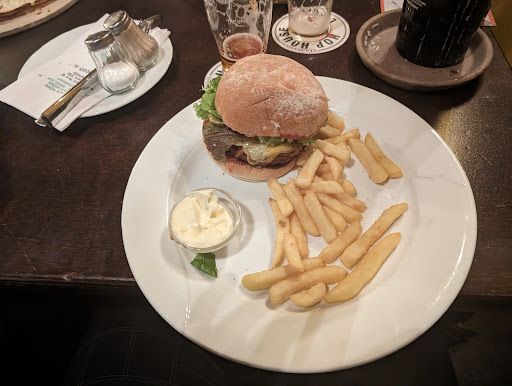 The food came quickly after ordering and was not only tasty looking, but also obviously fresh and hot. Whilst the burgers we're pretty good, I was disappointed to find out that the vegetarian option relied on a patty made of what seemed to be beans and potatoes. That in itself isn't inherently a problem, I tend to find these patties quite enjoyable, but the nature of the vegetarian patty wasn't communicated at all on the menu. That usually leaves me expecting a 'fake' meat patty that closely emulates the sensation of a regular burger. Adding to that was that the portion size was rather small, too small for 15€, I'd say. The menu said, that each burger came with fries and a side salad, but whether me nor my girlfriend got any salad on the side. I heard that the fish and chips and flammkuchen were delicious and pretty sizeable though, so maybe we just rolled unlucky on our order.
