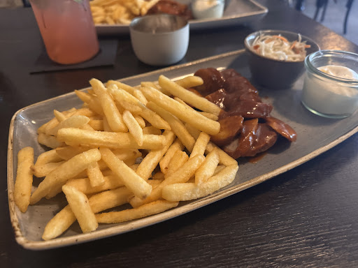 Das Gin&Jagger auf der Rüttenscheider Straße 181 ist ein cooles, modernes und sehr sauberes Restaurant. Zur Mittagszeit war es eher ruhig, was angenehm war. Allerdings störte ein etwas lautes Klopfen aus der Nähe der Bar, das vermutlich von der Zubereitung der Schnitzel herrührte – ein kleiner Minuspunkt in der ansonsten entspannten Atmosphäre. Wir bestellten zwei Currywürste, die klassisch und sehr lecker waren. Zwar keine besondere Geschmacksexplosion, aber eine solide Currywurst-Pommes, begleitet von einer wirklich guten Mayo. Preislich liegt das Gin&Jagger ein wenig über dem Durchschnitt, doch das ist für das Gebotene durchaus vertretbar. Eine kleine Anmerkung zum Getränkemenü: Das Weißbier-Angebot könnte etwas breiter sein, da nur eine Sorte (König Ludwig) verfügbar war. Ansonsten bietet das Gin&Jagger ein übersichtliches Menü in einem gemütlichen Ambiente. Wir hatten etwas mehr Exotik erwartet, doch letztlich ist es ein solides und angenehmes Restaurant, das eine gute Balance zwischen modernen Akzenten und klassischer Küche findet. Insgesamt ein gelungenes 4-Sterne-Erlebnis – ein Besuch lohnt sich auf jeden Fall