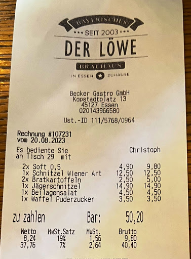 Read moreThe staff and the food was very good, however very careful with the prices. For example I ordered a „Schnitzel Wiener Art“ for 12,50€ as stated on the menu. The waiter then asked me to choose between French fries, fried potatoes and potato salad. I asked if these come with an additional charge and the waiter said no. My colleague was asked if he’d like a small side of salad (which is usually free in Germany, same with fries etc.). He said yes. After eating the food, which again was very tasty we asked for the bill. The waiter came and asked if we’d like to pay by card or cash. We said cash and were stated the amount without even receiving a bill. We had to ask for the bill specifically after we had paid. I did so because I paid suspiciously more than I had thought which I found weird. When we then got to see the bill I understood how I paid more than I thought. The side dishes we thought were free came at an additional charge! 2x fried potatoes for 2,50€ each + my colleagues small salad for 4,50€! After asking the waiter he explained that yes, fries are free, but fried potatoes and salads are not. However that is definitely not what was said while ordering. I specifically asked if these cost extra and the waiter just said no. He didn’t say only the fries are free. It’s such a shame because the food was really tasty. But this is unacceptable. And on a side note even if we knew these sides cost extra, the prices for them are ridiculous. 4,50 for a few pieces of lettuce and vegetables? Ouch!