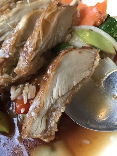 Read moreAlle Gerichte, die wir bestellt haben, kamen nur mit der Hälfte der angegebenen Zutaten. Auf ausdrückliche Bitte meiner Begleitung, aufgrund einer sehr starken Nussallergie süß-sauer-Soße anstelle von Erdnusssoße zu bekommen, wurde trotzdem Erdnusssoße direkt vor seine Nase gestellt. Wie wir leider sehr spät gemerkt haben, befanden sich KATZENHAARE in einem der Gerichte - ironischerweise in dem Essen eines Tierhaarallergikers. Bis dahin wars immerhin ganz lecker. Für alles (Bestellung, Besteck, Retoure der Soße usw.) musste man auf das Personal zugehen, wobei wir bei 5 Kontakten mit diesem auch mit 5 verschiedenen Leuten sprachen und niemand wusste, was der andere macht. Am Ende wurde versehentlich viel zu wenig berechnet, was ich dann mal so durchgehen ließ, da ich auch überlegt hatte, wegen der Tierhaare und falscher Anreichung der Gerichte gar nicht zu bezahlen.